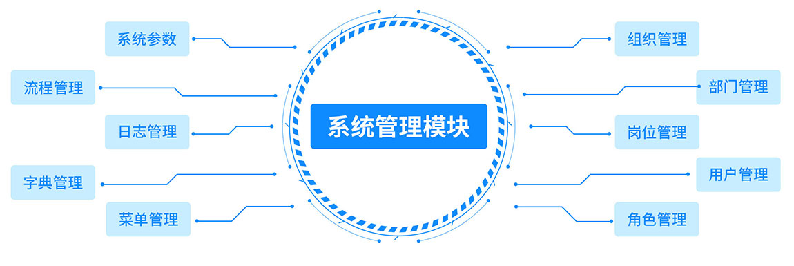 系統(tǒng)管理模塊提供各項基礎(chǔ)參數(shù)配置,用于支撐系統(tǒng)人員層級的管理和人員權(quán)限的控制以及離散屬性的配置如各項閥值等。包含組織管理、部門管理、崗位管理、角色管理、用戶管理、菜單管理、字典管理、日志管理、系統(tǒng)參數(shù)、流程管理。